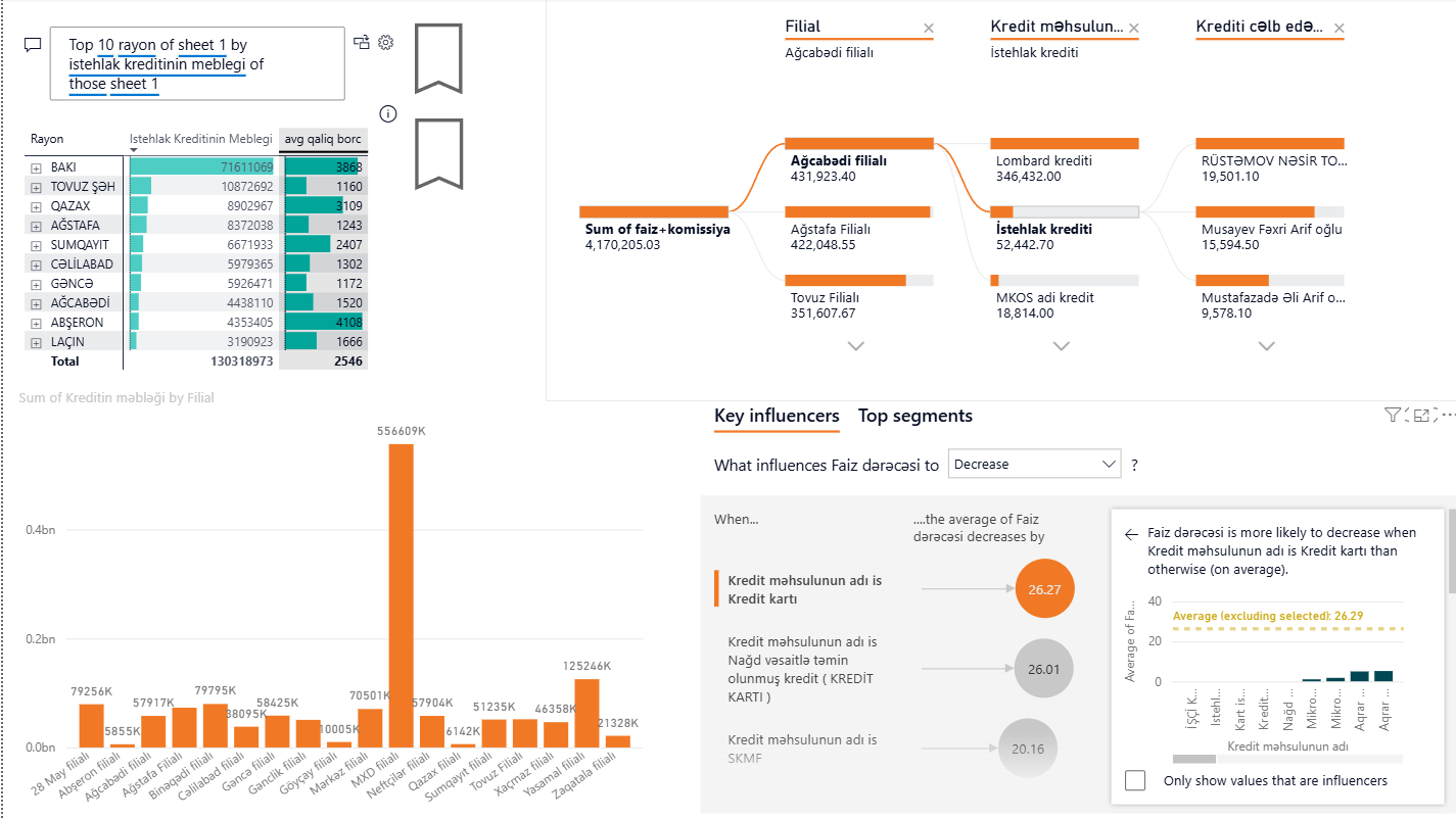 - Key Influencers: Faiz dərəcəsinin azalmasına təsir edən əsas faktorların analizi (məsələn, Kredit kartı məhsulunun təsiri).