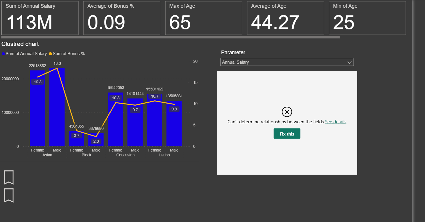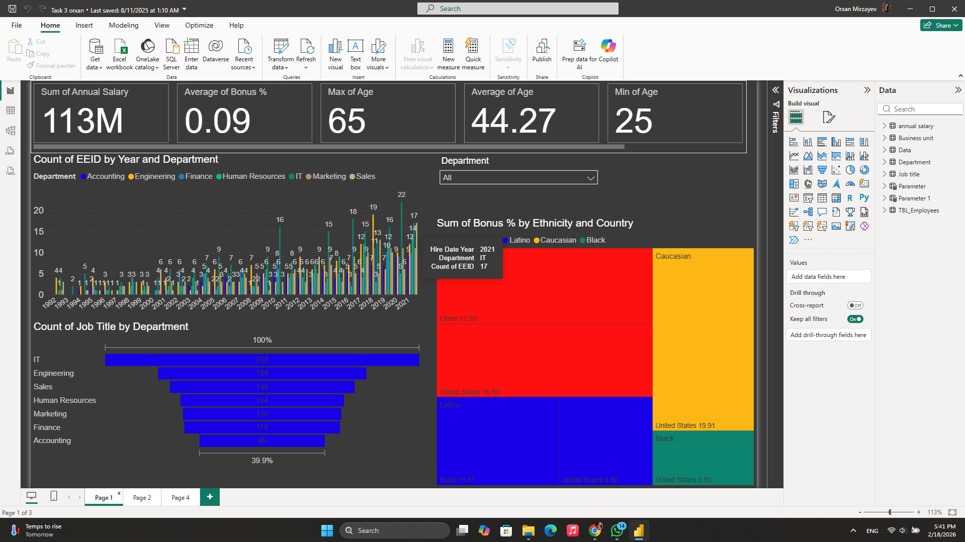 - Maaş və Bonus Analizi: Bonus faizlərinin (orta 0.09) etnik mənsubiyyət və ölkələr üzrə bölgüsü.