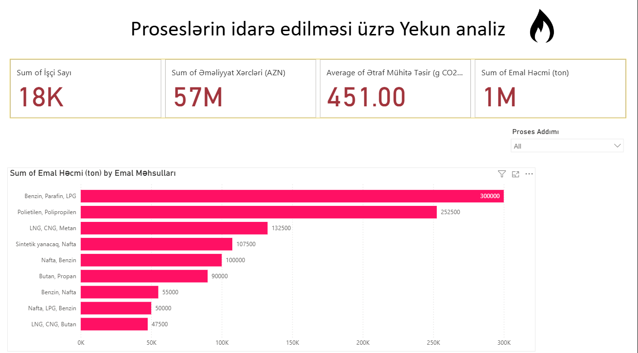 - Vizuallaşdırma: Bar chart vasitəsilə emal məhsullarının (Benzin, Parafin, LPG və s.) həcm üzrə müqayisəsi.