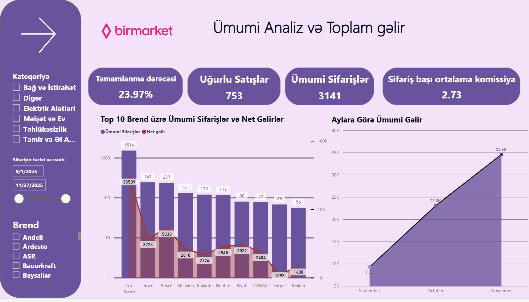 - Dinamik Analiz: Sifariş statusları, gəlir trendləri və brend performansı üzrə dərindən analiz.