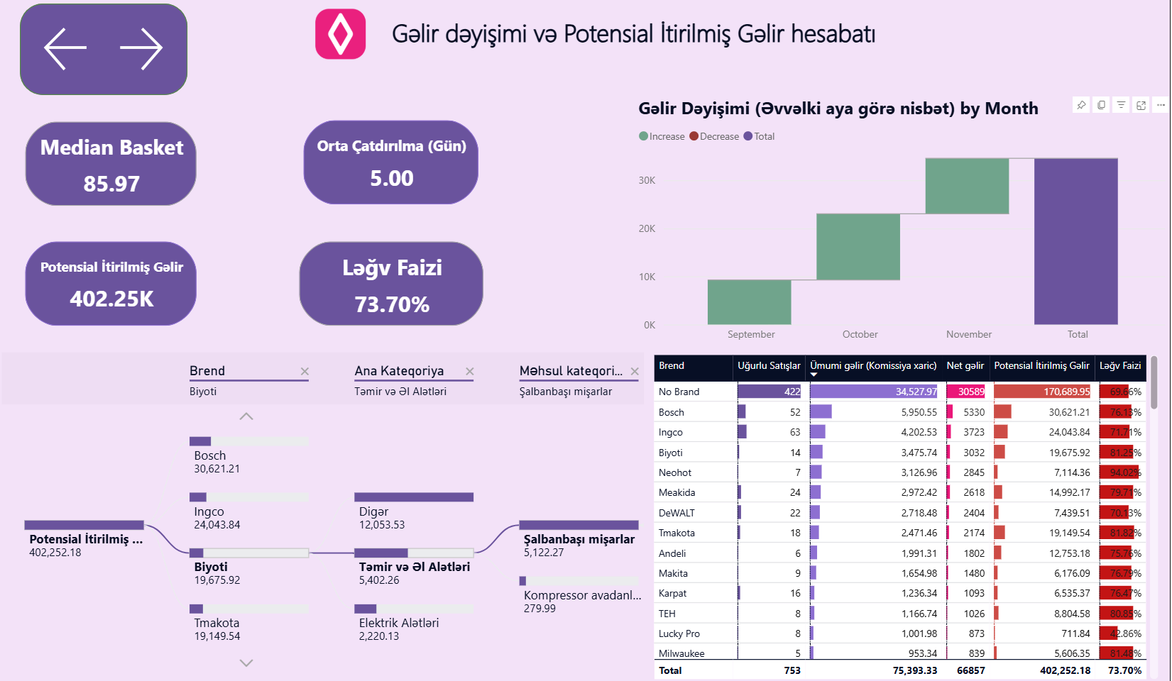 - İtirilmiş Gəlir: “Waterfall Chart” vasitəsilə noyabr ayındakı kəskin satış artımını və itkilərin hansı kateqoriyalarda (məsələn, Elektrik alətləri) cəmləşdiyini müəyyən etdim.