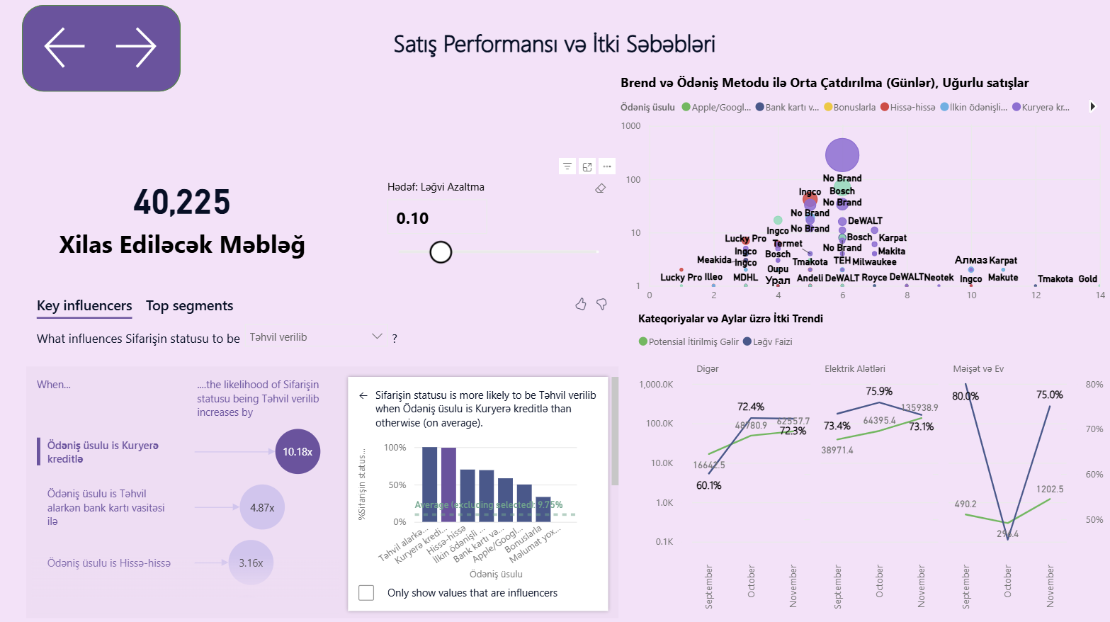 - Ödəniş Metodu Təsiri: “Key Influencers” vizualı göstərir ki, kuryerdə kreditlə ödəniş uğurlu çatdırılma şansını 10 dəfədən çox artırır.